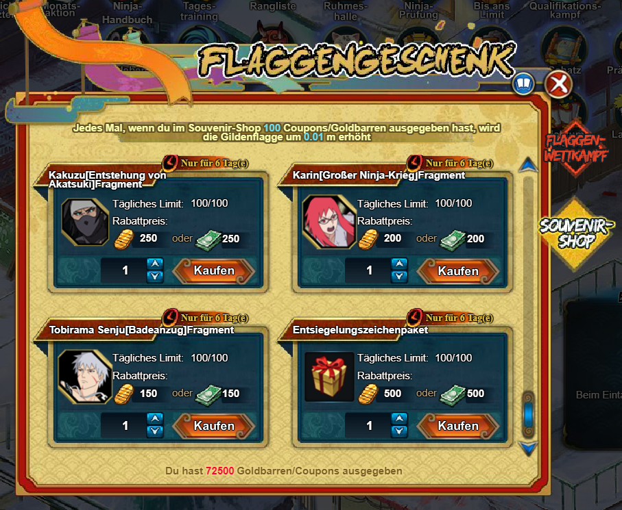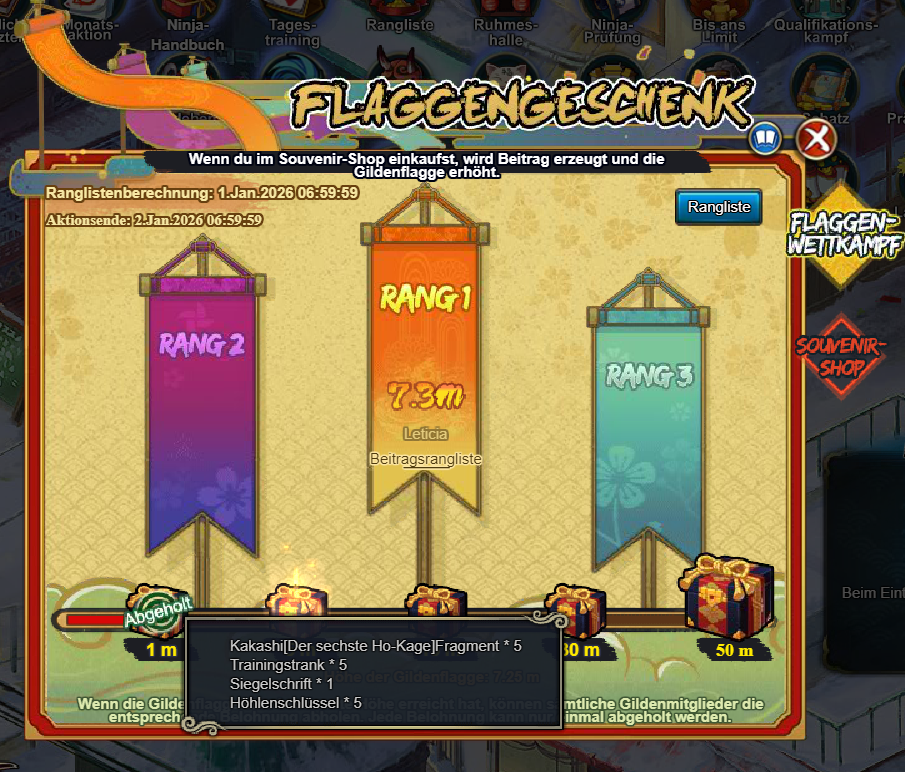 "Kaufe während der Aktionszeit im Souvenir-Shop ein, um Beitrag zu erzeugen, womit die Gildenflagge erhöht wird. Jedes Mal, wenn du 100 Goldbarren oder Coupons ausgibst, wird die Flagge um 0.01 m erhöht.