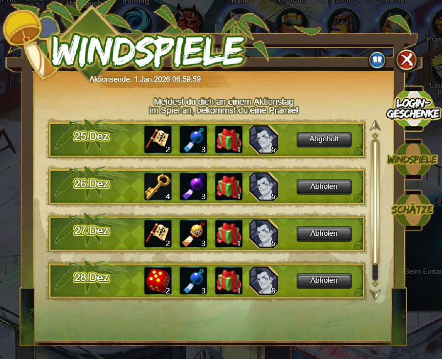 Während der Aktionszeit kannst du jeden Tag ein Login-Geschenk abholen. Außerdem hast du jeden Tag bei Siegen in der Arena und bei der Überlebensprüfung die Chance, Windspiele zu erhalten. Wenn du mit deinen Kameraden beim Bindungsduell, bei Gruppenmissionen und bei „Für Experten“ gewinnst, hast du zudem die Chance auf goldene Windspiele. Jeden Tag kannst du maximal 5 Windspiele kostenlos erhalten, weitere kannst du für 30 Coupons/Goldbarren kaufen.