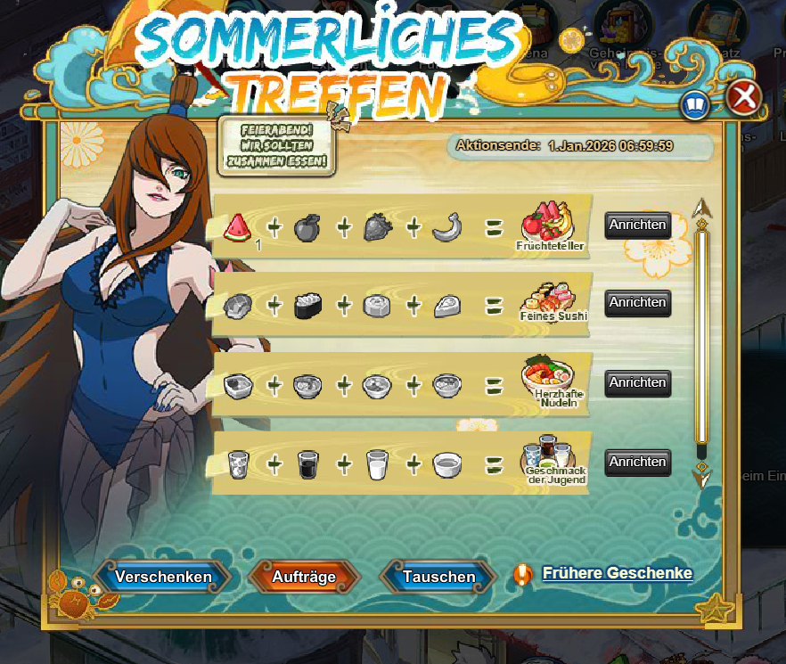 "Beim Abschließen von Aufträgen erhältst du täglich zufällige Lebensmittel. Immer wenn du eine Kategorie Lebensmittel komplett hast, kannst du ein Geschenkpaket abholen. Überzählige Lebensmittel kannst du an Freunde verschenken. Jedes Paket kann innerhalb der Aktionszeit nur 1-mal abgeholt werden. Die Pakete enthalten eine unterschiedliche Anzahl Sommermedaillen, die gegen Gegenstände eingetauscht werden können.