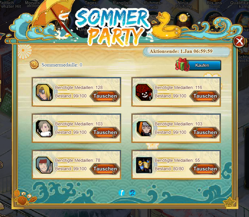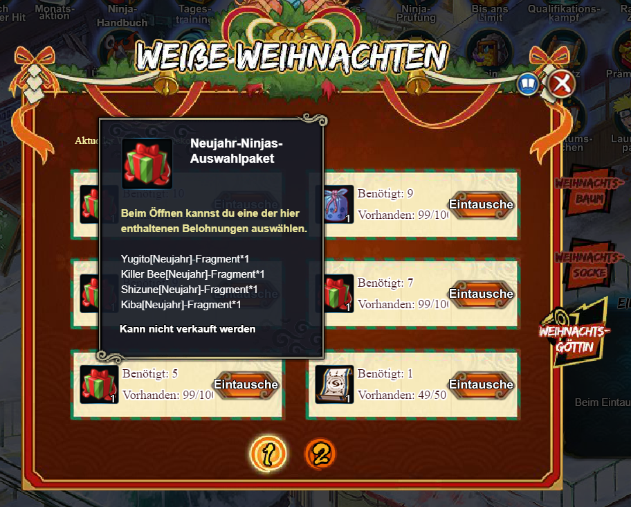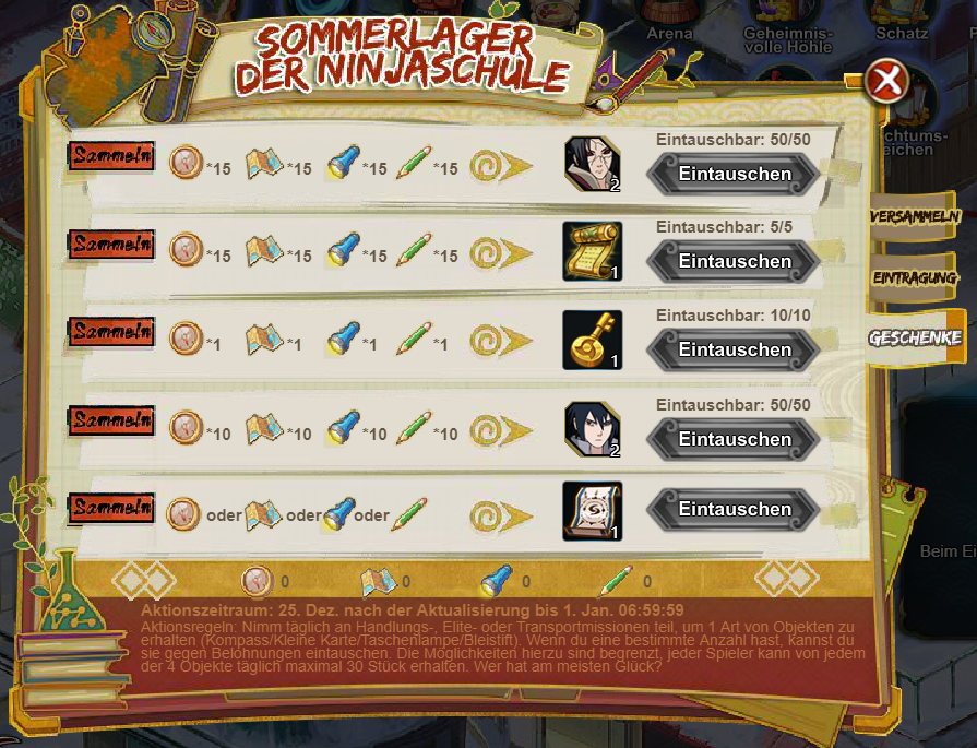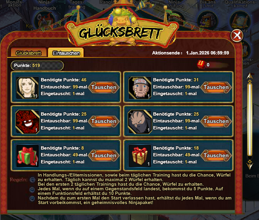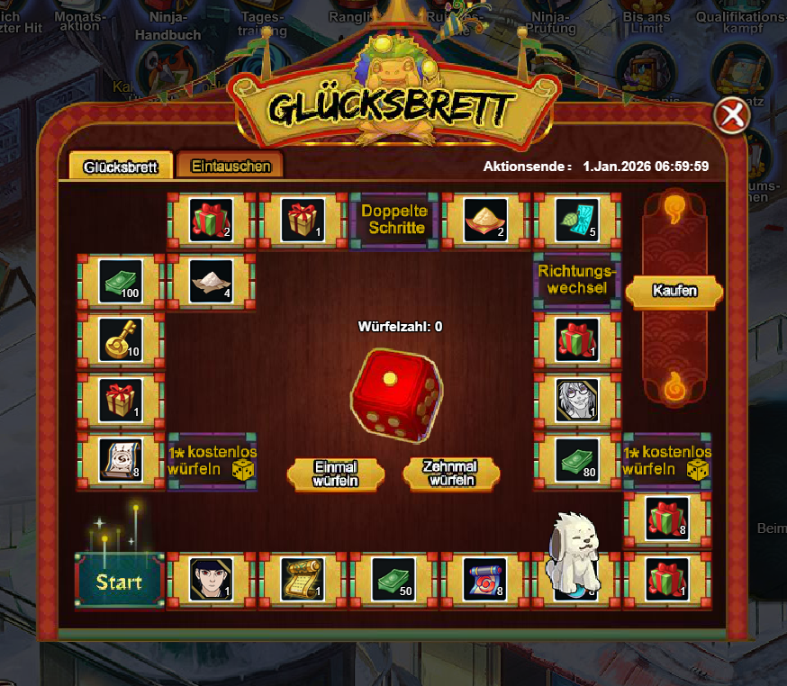 "Während der Aktionszeit kannst du würfeln, um tolle Belohnungen zu erhalten. Die Würfel kannst du beim Tagestraining, sowie durch Handlungs- und Elitemissionen erhalten. Du kannst die Würfel auch für 50 Coupons/Goldbarren kaufen. Nachdem du zum ersten Mal den Start verlassen hast, erhältst du jedes Mal, wenn du am Start vorbeikommst, ein geheimnisvolles Ninjapaket.