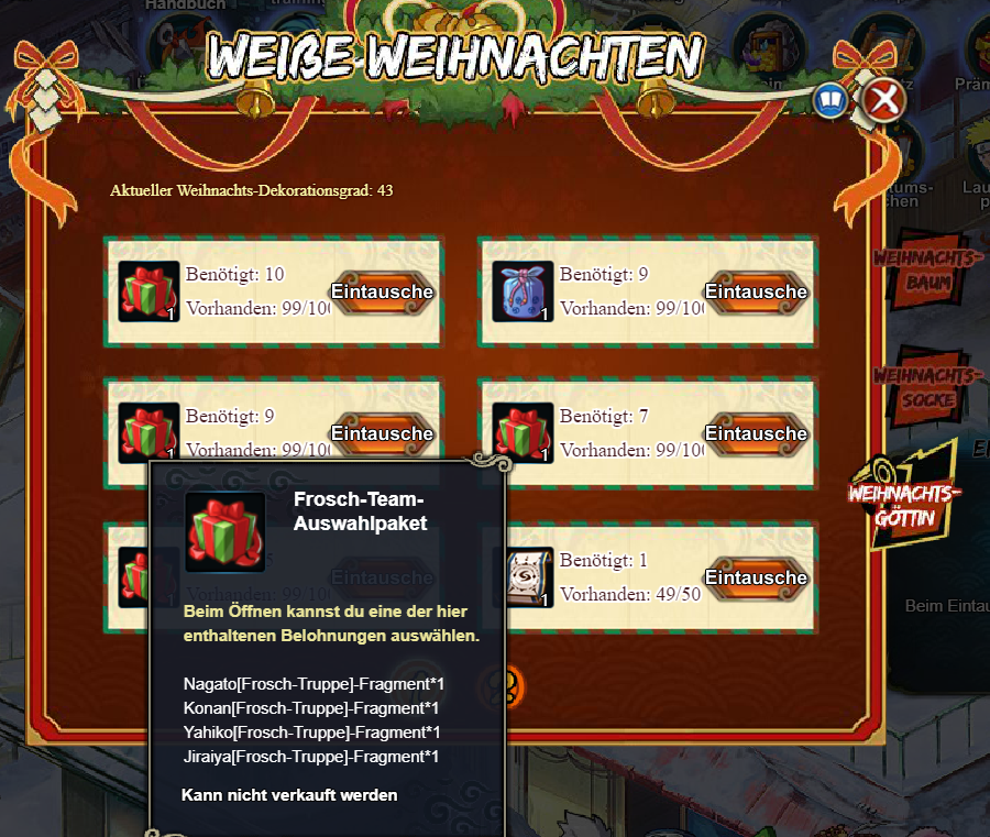 Du kannst täglich 1-mal ein [Versammulungspaket] abholen.Beim Öffnen des Pakets erhältst du eine zufällige Belohnung.Komm und schau,wer am meisten Glück hat! Jeden Morgen um 5 Uhr wird aktualisiert. Wenn du es bis dann nicht abgeholt hast, geht es verloren!