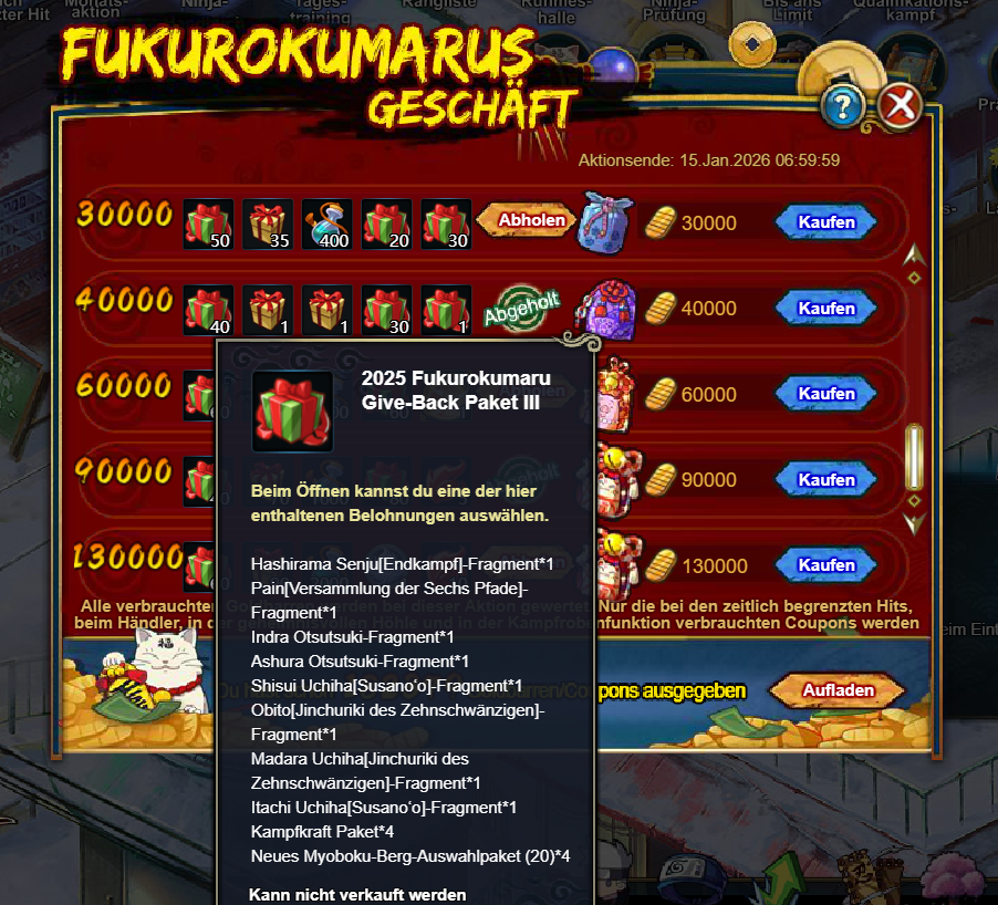 30000 Goldbarren/Coupons: 2025 Fukurokumaru Give-Back Paket I*50, Geheimrolle Unterstüzungspaket*35, Trainingstrank*400,Kampfkraftpaket*20, 2025 Neues Myoboku-Berg-Auswahlpaket (20)*3