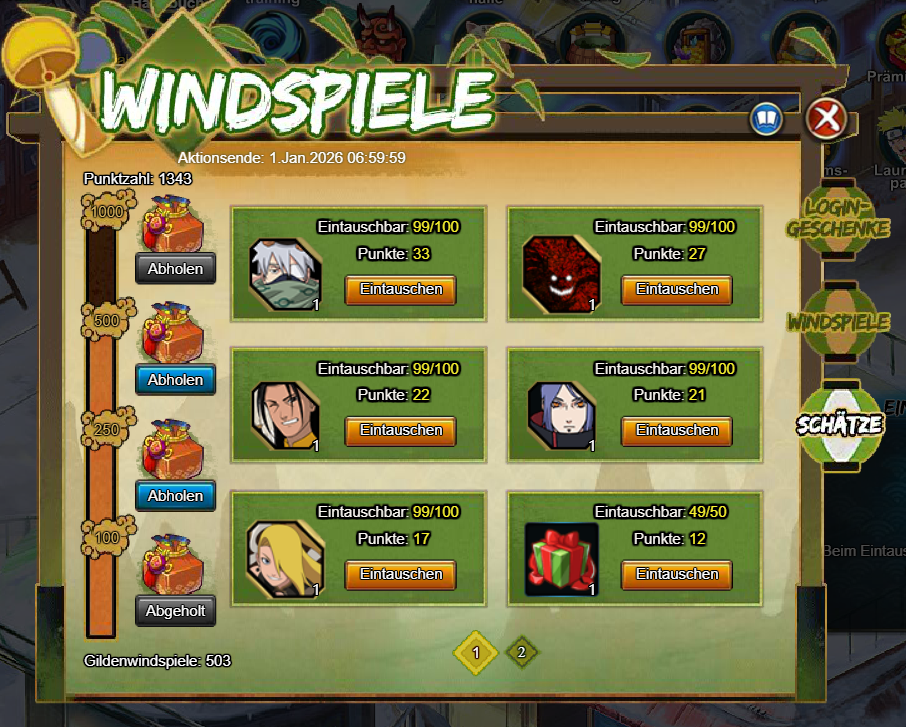 Jedes Mal, wenn du ein Windspiel an den Busch hängst, erhältst du einen Punkt. Wenn du in einer Gilde bist, wird die gesamte Anzahl Windspiele aller Gildenmitglieder angezeigt. Wenn die Anzahl einen bestimmten Wert erreicht, kannst du zusätzliche Belohnungen abholen. Die Punkte können gegen Belohnungen eingetauscht werden. Beim Benutzen eines goldenen Windspiels kannst du zudem noch deine Glückwünsche mitschicken.