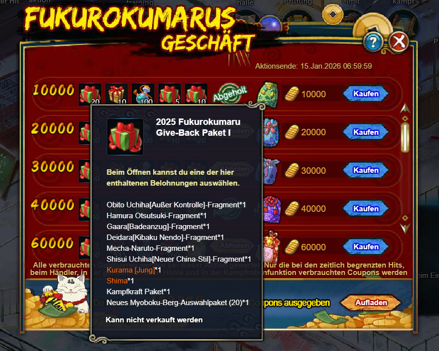 10000 Goldbarren/Coupons: 2025 Fukurokumaru Give-Back Paket I*20, Geheimrolle Unterstüzungspaket*10, Trainingstrank*100,Kampfkraftpaket*5, 2025 Neues Myoboku-Berg-Auswahlpaket (20)*1
