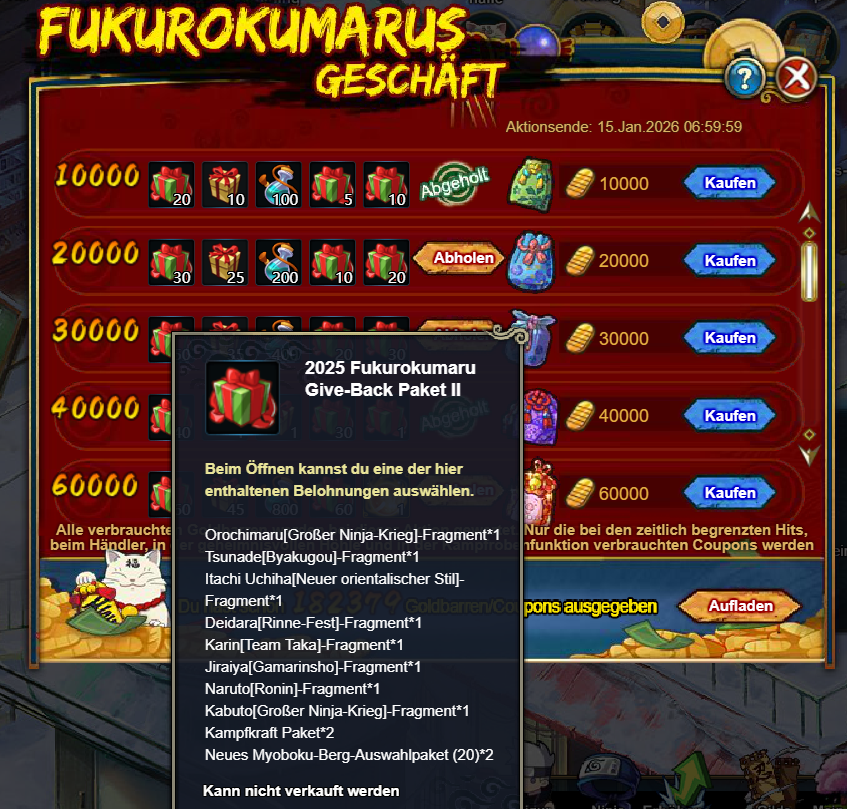 60000 Goldbarren/Coupons: 2025 Fukurokumaru Give-Back Paket II*60, Geheimrolle Unterstüzungspaket*45, Trainingstrank*800,Kampfkraftpaket*60, Edle Schatzessenz*2