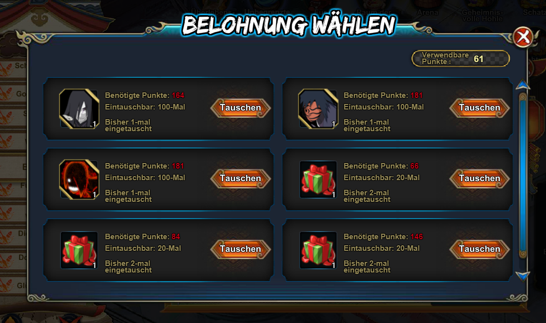 Alle verbrauchten Goldbarren werden bei dieser Aktion gewertet. Nur die bei den zeitlich begrenzten Hits, beim Händler, in der geheimnisvollen Höhle und in der Kampfrobenfunktion verbrauchten Coupons werden bei dieser Aktion gewertet."