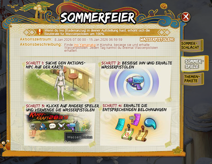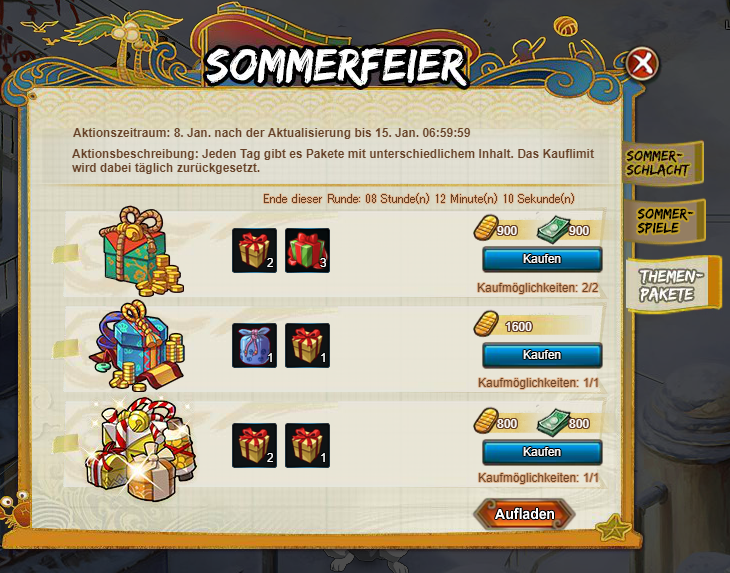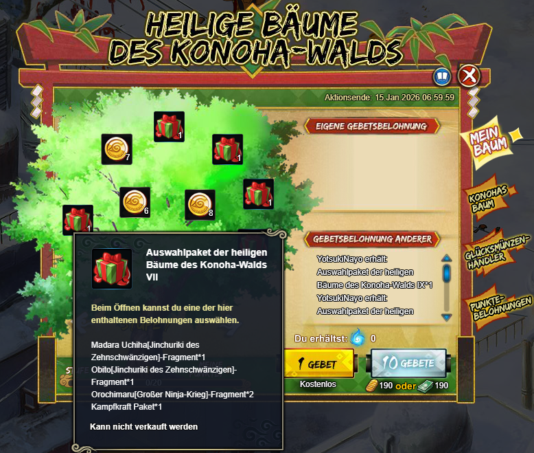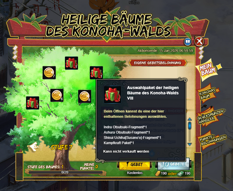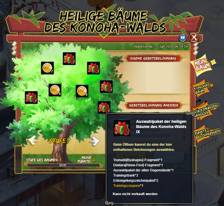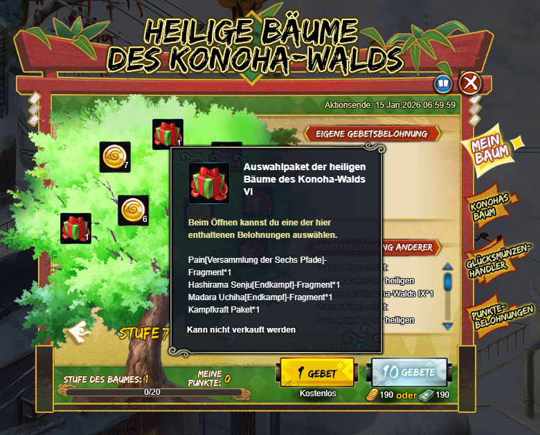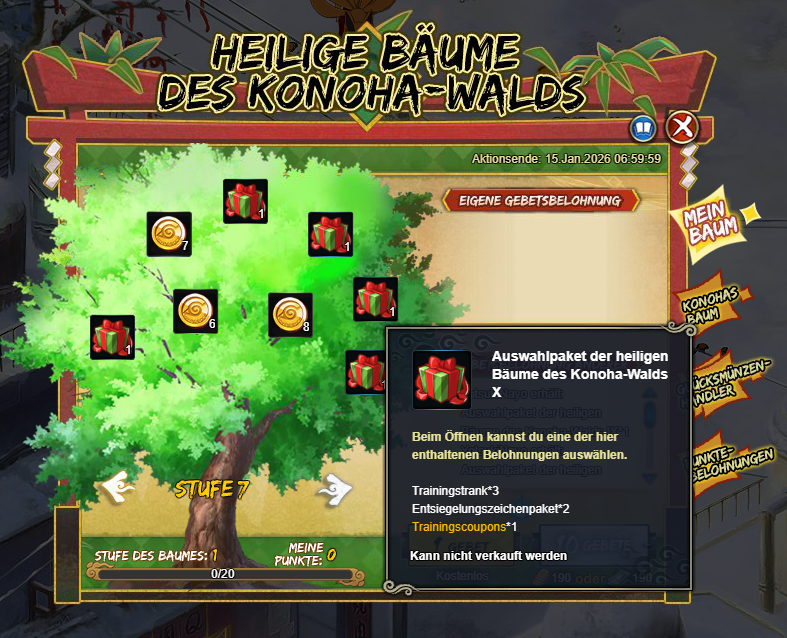 "Während der Aktionszeit gibt es im Konoha-Fachgeschäft limitierte Pakete und Objekte. Die Kaufmöglichkeiten werden täglich um 5 Uhr morgens zurückgesetzt.