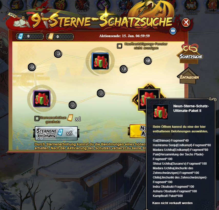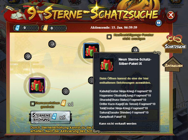 "Bei der 9-Sterne-Schatzsuche beträgt die anfängliche Sternenstufe 0. Für jede Sternenerhöhung werden Sternenerhöhungskarten verbraucht, die Anzahl ist je nach Sternenstufe unterschiedlich. Es besteht jeweils eine bestimmte Wahrscheinlichkeit, dass die Sternenerhöhung erfolgreich verläuft. Falls sie fehlschlägt, wird 1 Stern abgezogen. Durch Benutzen von Sternenschutzkarten werden bei fehlgeschlagenen Erhöhungen keine Sterne abgezogen. Die Anzahl verbrauchter Sternenschutzkarten ist je nach Sternenstufe unterschiedlich.