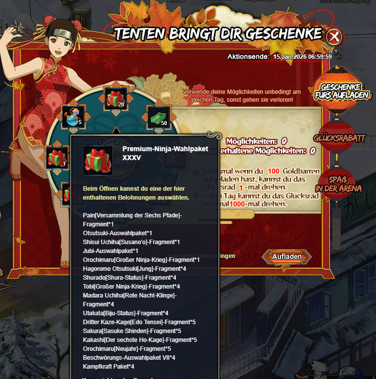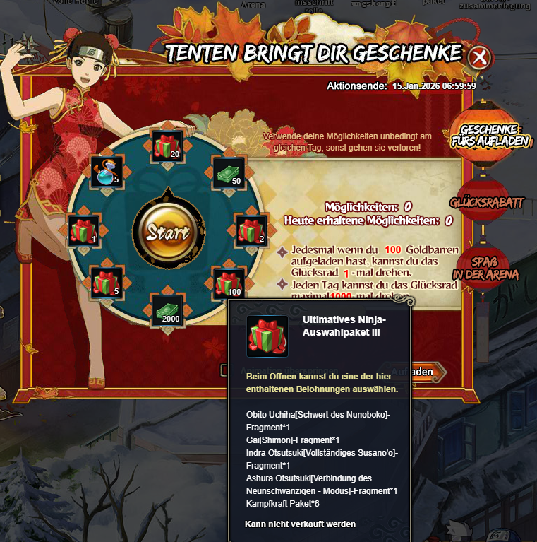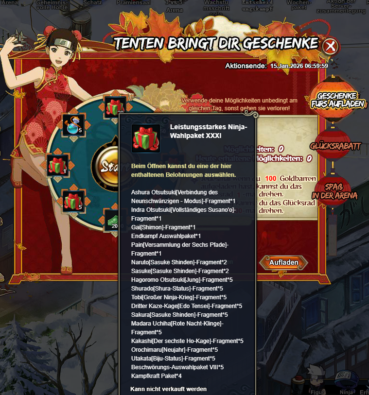 Durch tägliches Einloggen und Abschließen des vorgegebenen Auftrags erhältst du entsprechende Aktivitätspunkte. Beim Öffnen der Wundertüte gibt es auf jeden Fall ein Ninja-Fragment und eine Chance auf weitere Gegenstände.Details zur Aktion findest du unter „Zeitlich begrenzter Hit“.Täglich kannst du maximal 25 Wundertüten erhalten.