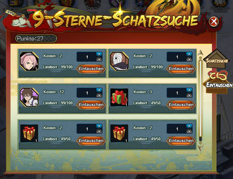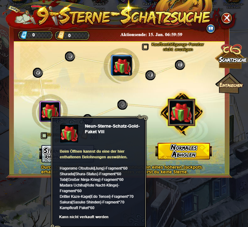 500 Goldbarren (Glückswert*50): Naruto [Sasuke Shinden]-Fragment*1(Limit: 80)