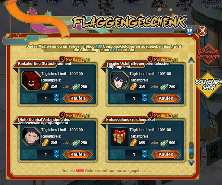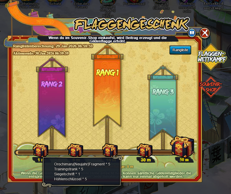 "Kaufe während der Aktionszeit im Souvenir-Shop ein, um Beitrag zu erzeugen, womit die Gildenflagge erhöht wird. Jedes Mal, wenn du 100 Goldbarren oder Coupons ausgibst, wird die Flagge um 0.01 m erhöht.
