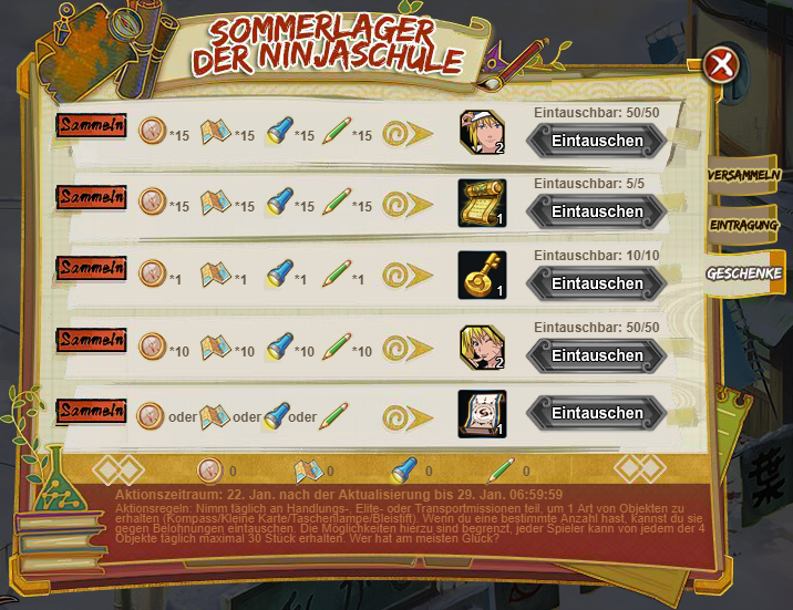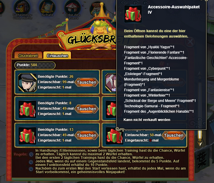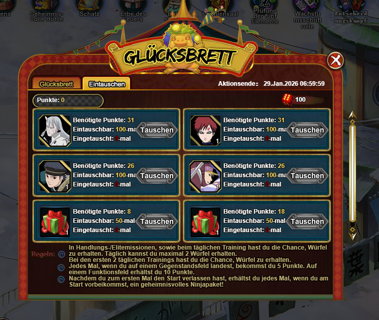 "Während der Aktionszeit kannst du würfeln, um tolle Belohnungen zu erhalten. Die Würfel kannst du beim Tagestraining, sowie durch Handlungs- und Elitemissionen erhalten. Du kannst die Würfel auch für 50 Coupons/Goldbarren kaufen. Nachdem du zum ersten Mal den Start verlassen hast, erhältst du jedes Mal, wenn du am Start vorbeikommst, ein geheimnisvolles Ninjapaket.
