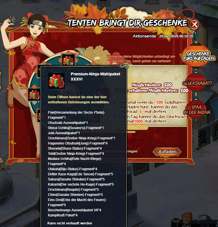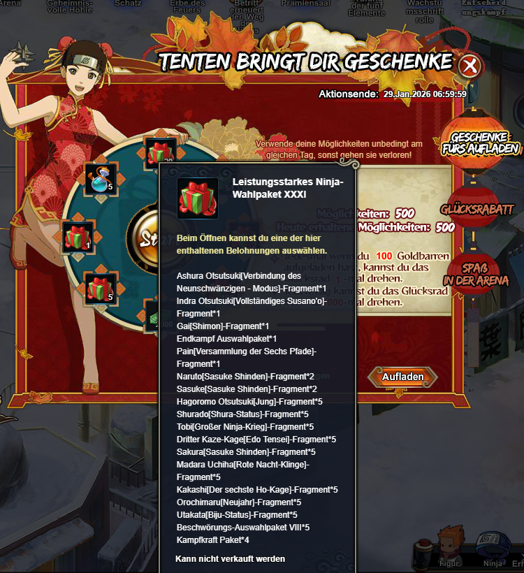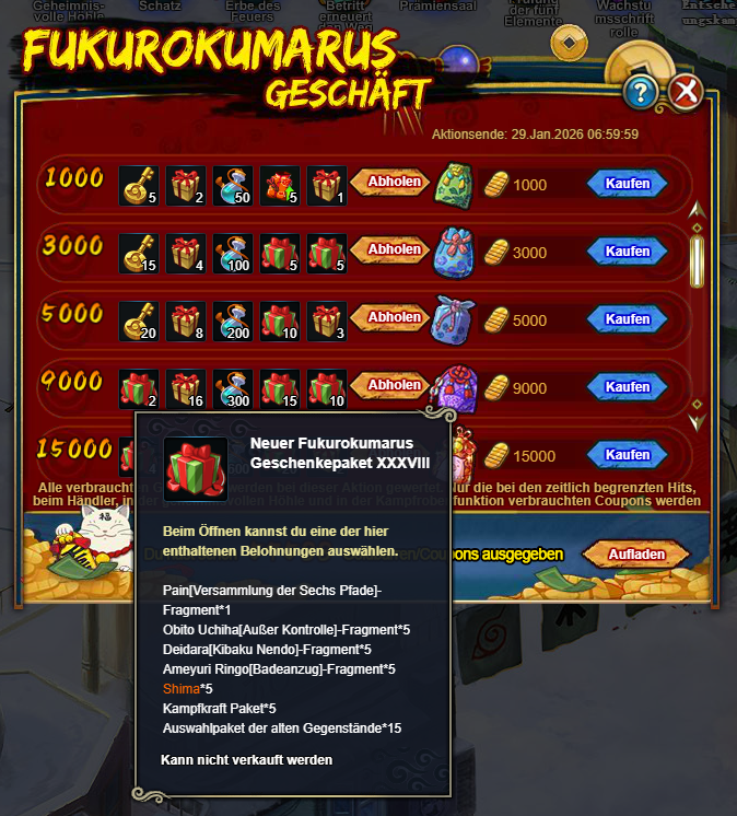 20000 Goldbarren/Coupons: Neuer Fukurokumarus Geschenkepaket XXXVIII*6, Geheimrolle Unterstüzungspaket*40, Trainingstrank*800,2025 Neues Myoboku-Berg-Auswahlpaket (20)*25, Amulett-Auswahlpaket*2
