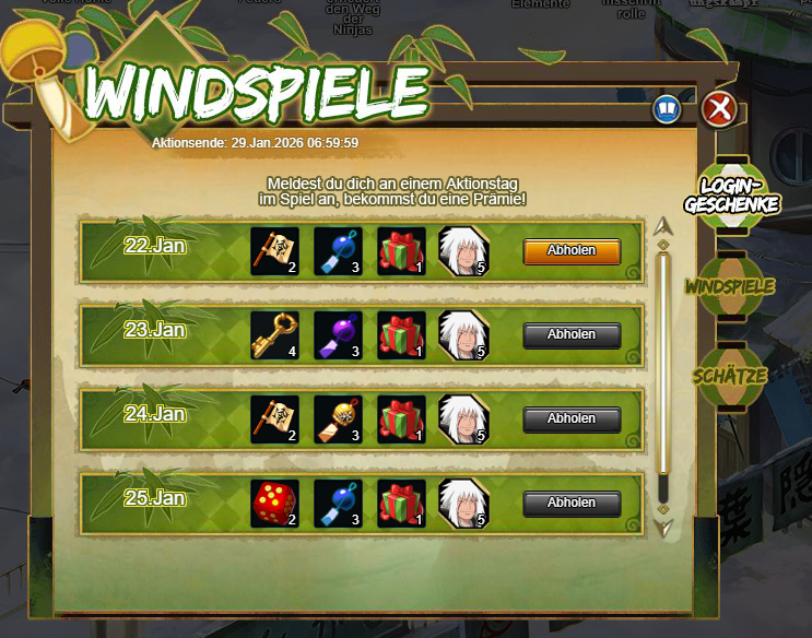 Während der Aktionszeit kannst du jeden Tag ein Login-Geschenk abholen. Außerdem hast du jeden Tag bei Siegen in der Arena und bei der Überlebensprüfung die Chance, Windspiele zu erhalten. Wenn du mit deinen Kameraden beim Bindungsduell, bei Gruppenmissionen und bei „Für Experten“ gewinnst, hast du zudem die Chance auf goldene Windspiele. Jeden Tag kannst du maximal 5 Windspiele kostenlos erhalten, weitere kannst du für 30 Coupons/Goldbarren kaufen.