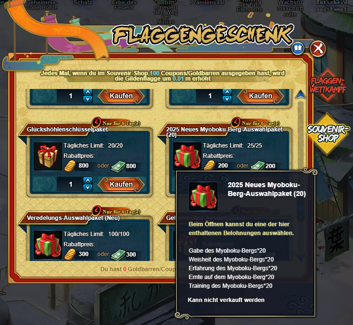500Goldbarren: Geheimrolle Unterstüzungspaket*2, Trainingstrankpaket*2, 2025 Neues Myoboku-Berg-Auswahlpaket (20)*1