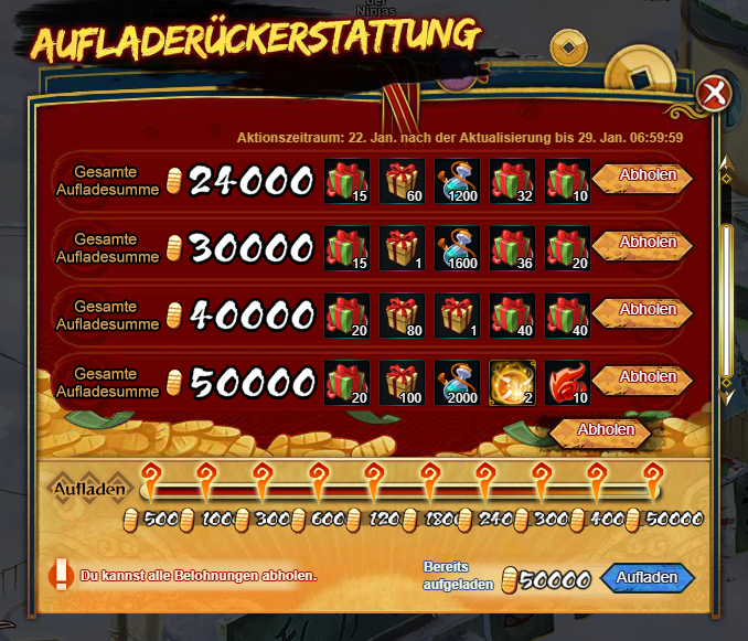 """Wenn deine gesamten aufgeladenen Goldbarren eine bestimmte Summe erreichen, kannst du eine Belohnung abholen. Während des Aktionszeitraums kann jede Belohnung nur einmal abgeholt werden.