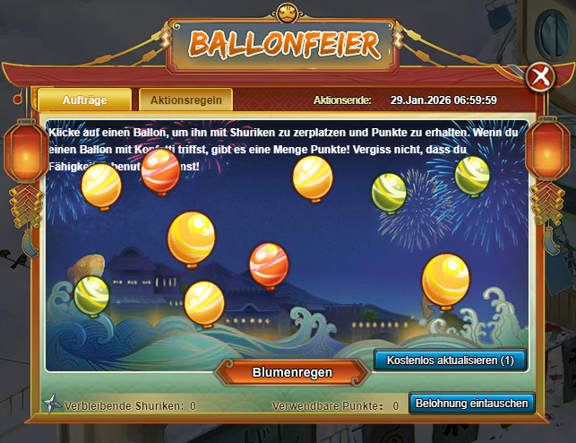"Du erhältst jedes Mal 1 Shuriken, wenn du 10 Goldbarren ausgibst. Beim Abschließen der täglichen Aufträge hast du ebenfalls eine Chance auf eine bestimmte Anzahl Shuriken. Mit Shuriken kannst du Ballons platzen lassen, um Punkte zu erhalten, die gegen tolle Objekte eingetauscht werden können.