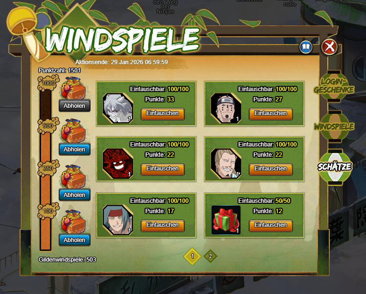Jedes Mal, wenn du ein Windspiel an den Busch hängst, erhältst du einen Punkt. Wenn du in einer Gilde bist, wird die gesamte Anzahl Windspiele aller Gildenmitglieder angezeigt. Wenn die Anzahl einen bestimmten Wert erreicht, kannst du zusätzliche Belohnungen abholen. Die Punkte können gegen Belohnungen eingetauscht werden. Beim Benutzen eines goldenen Windspiels kannst du zudem noch deine Glückwünsche mitschicken.