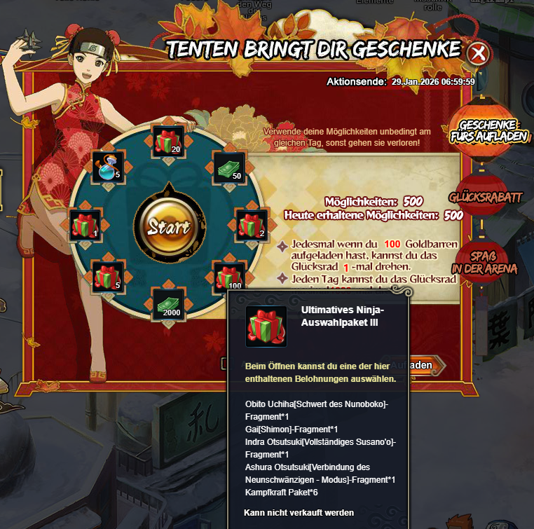 "Aufladeprämie: Bei jedem Aufladen von 100 Goldbarren erhältst du eine kostenlose Drehmöglichkeit für das Glücksrad. Täglich kannst du bis zu 100-mal drehen. Verwende deine Drehmöglichkeiten unbedingt am gleichen Tag, sonst gehen sie verloren.