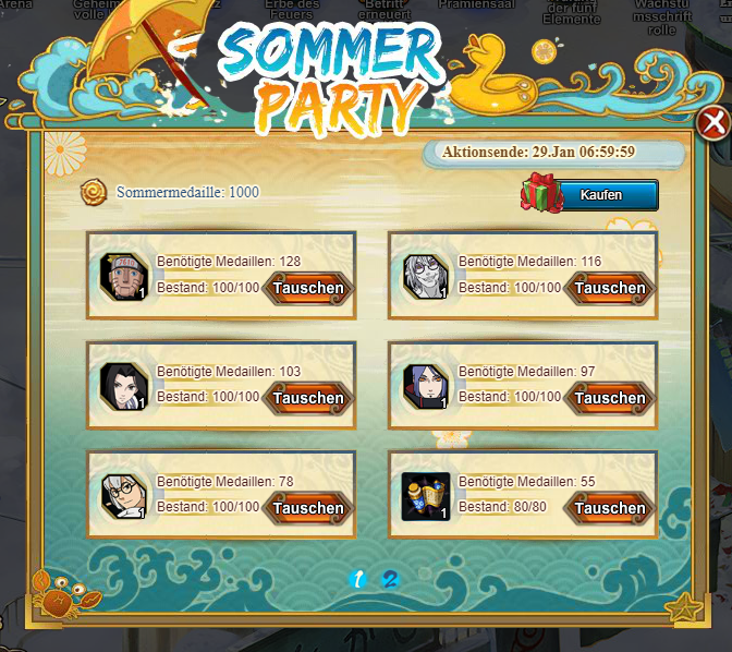1000 Goldbarren/Coupons: Höhlenschlüssel*5, Geheimrolle Unterstüzungspaket*2, Trainingstrank*50,Kostbarer Stoff*5, Kampftaktik-Auswahlpaket*1