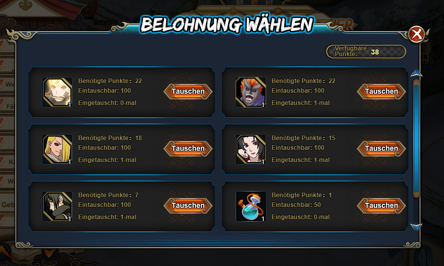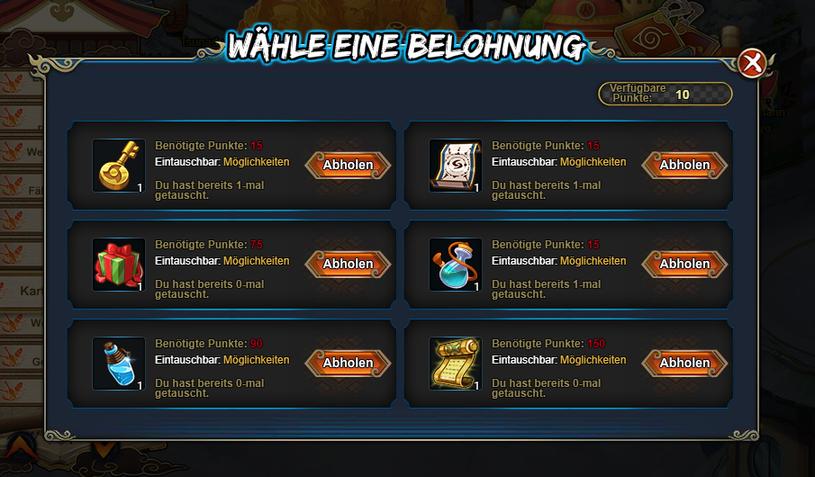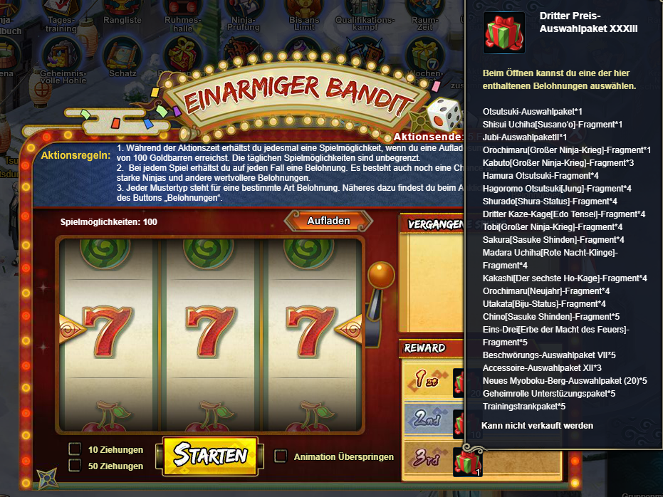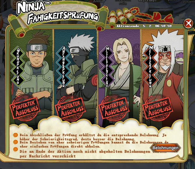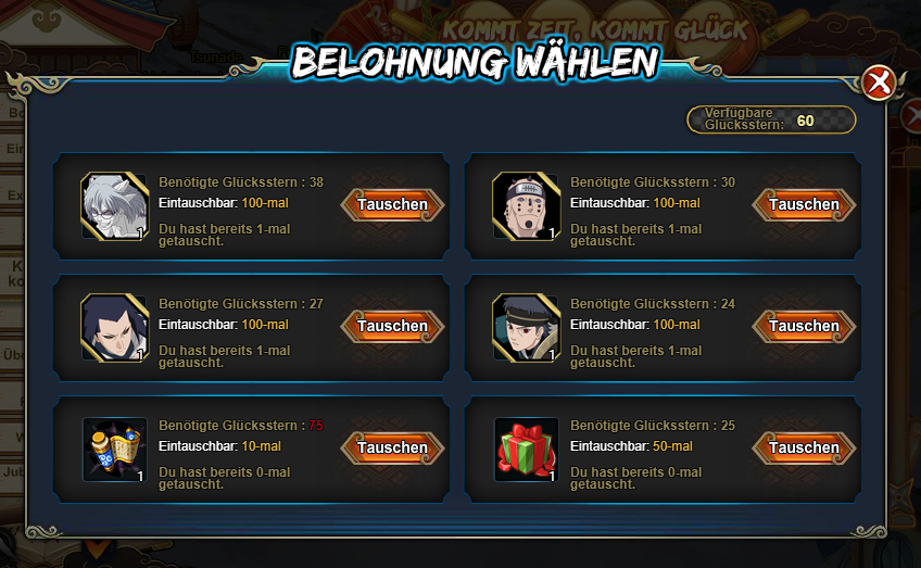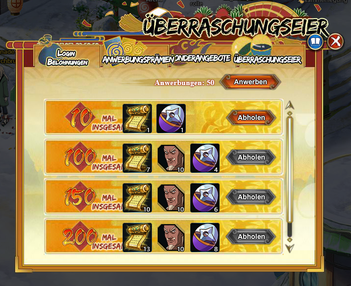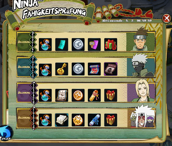 Ziehen Sie eine bestimmte Anzahl von Malen aus der NinjakriegsTruhe, Zeitlich Begrenzte Truhe I, Zeitlich Begrenzte Truhe II, Zeitlich Begrenzte Truhe IV, Zeitlich Begrenzte Truhe V, Zeitlich Begrenzte Truhe VI um Preise zu erhalten. Kostenlose Ziehungen zählen nicht!