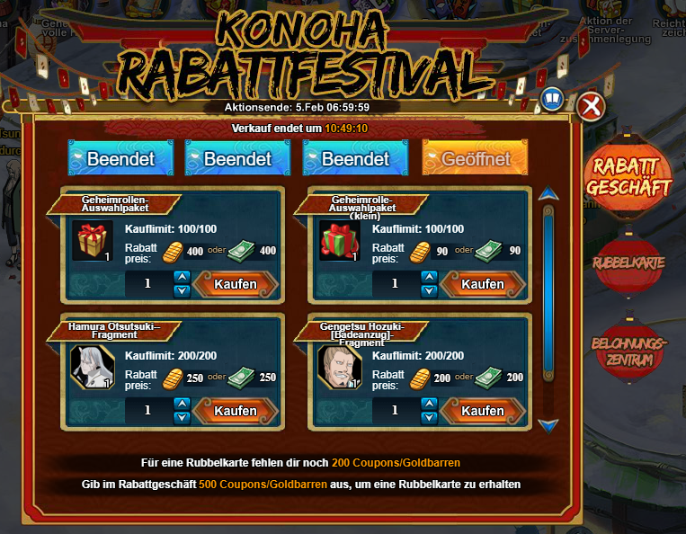 "Jedes Mal, wenn du im Rabattgeschäft 500 Coupons/Goldbarren ausgibst, erhältst du eine Rubbelkarte. Wenn du verschiedene Karten gesammelt hast, kannst du bestimmte Kombinationen gegen Belohnungen eintauschen. Es gibt insgesamt vier Rabattgeschäfte, die nacheinander an unterschiedlichen Tagen geöffnet werden. Du kannst nur während den Öffnungszeiten einkaufen.