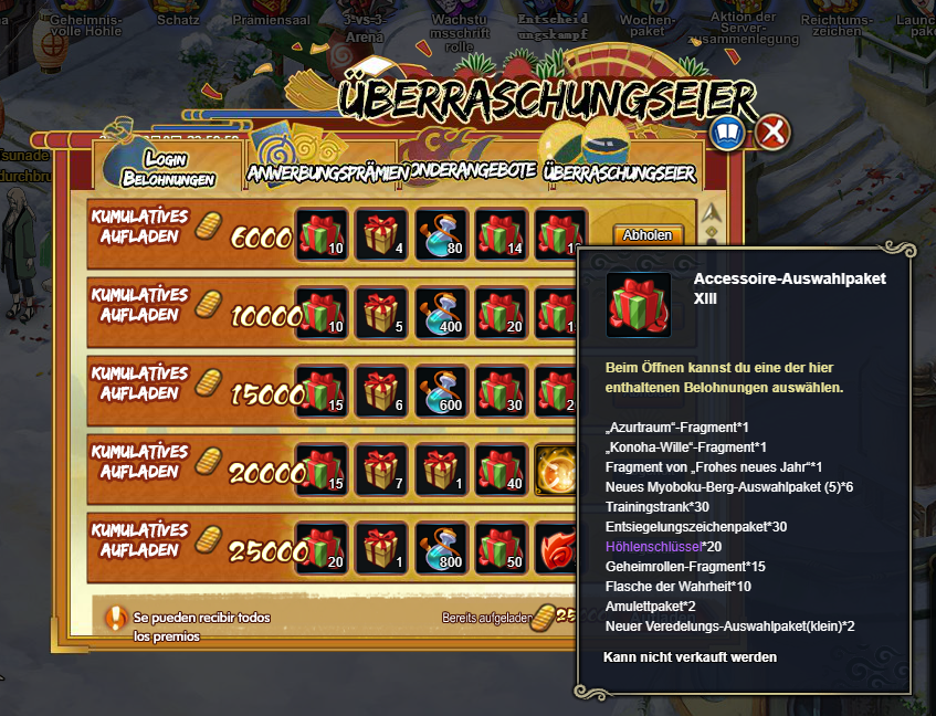10000Goldbarren: Ninja-Auswahl-Sparpaket XXV*10, Geheimrolle Unterstüzungspaket*5, Trainingstrank*400,2025 Neues Myoboku-Berg-Auswahlpaket (20)*20, Accessoire-Auswahlpaket XIII*15