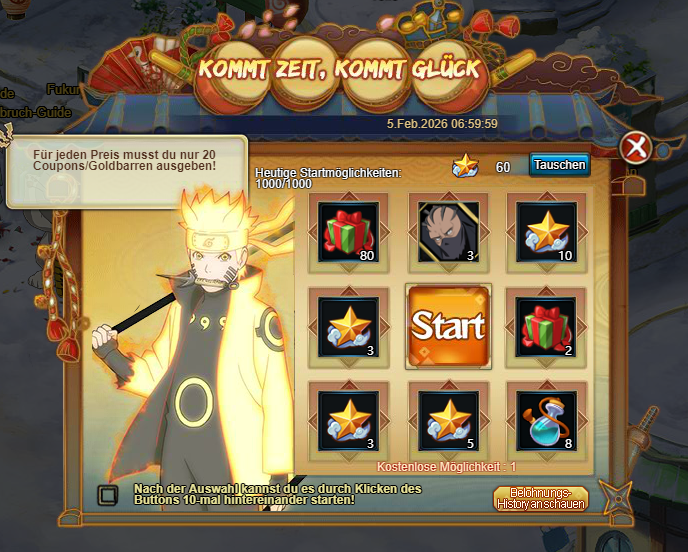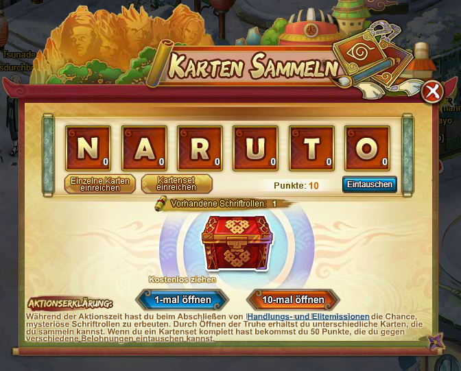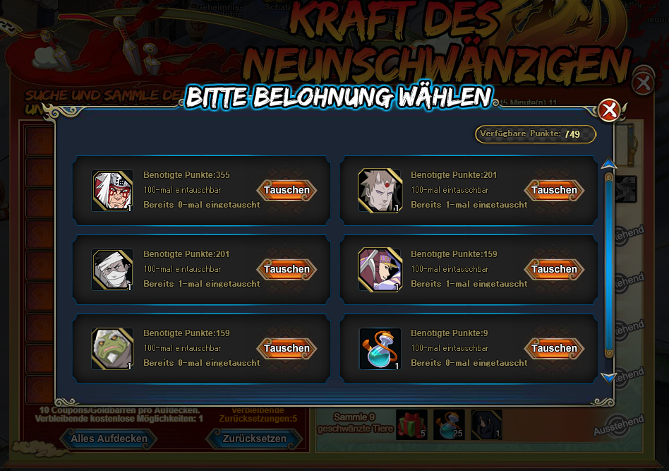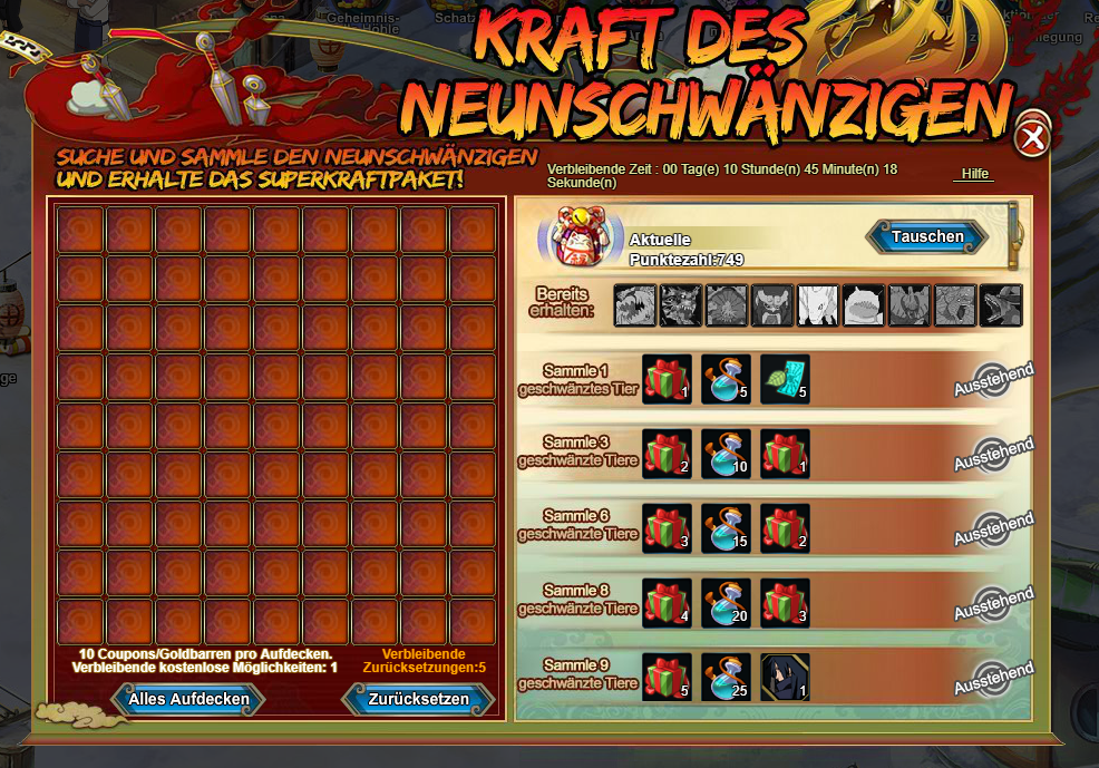 "Suche und sammle den Neunschwänzigen und erhalte das Superkraftpaket! Jedes Mal, wenn du eine bestimmte Anzahl geschwänzte Tiere komplett hast, kannst du die entsprechende Belohnung abholen. Beim Aufdecken einer Karte erhältst du zudem zwischen 5 und 20 Punkten. Diese kannst du im Eintauschfenster gegen Objekte eintauschen. Um eine Karte aufzudecken werden 10 Coupons/Goldbarren verbraucht, täglich gibt es 1 kostenlose Möglichkeit.