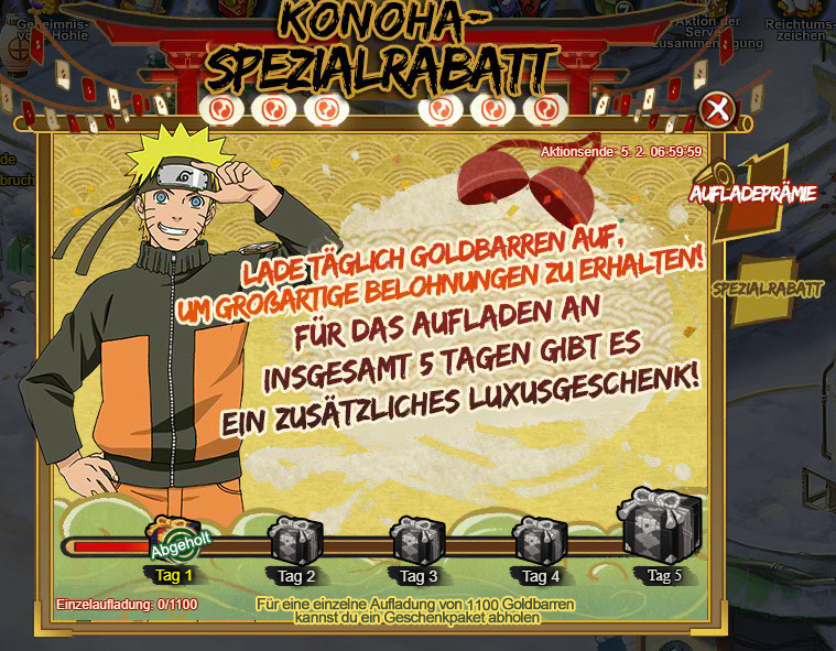 "Jeden Tag kannst du beim Aufladen von 1100 Goldbarren eine Belohnung abholen! Bei insgesamt 5 Tagen gibt es ein Luxusgeschenk.