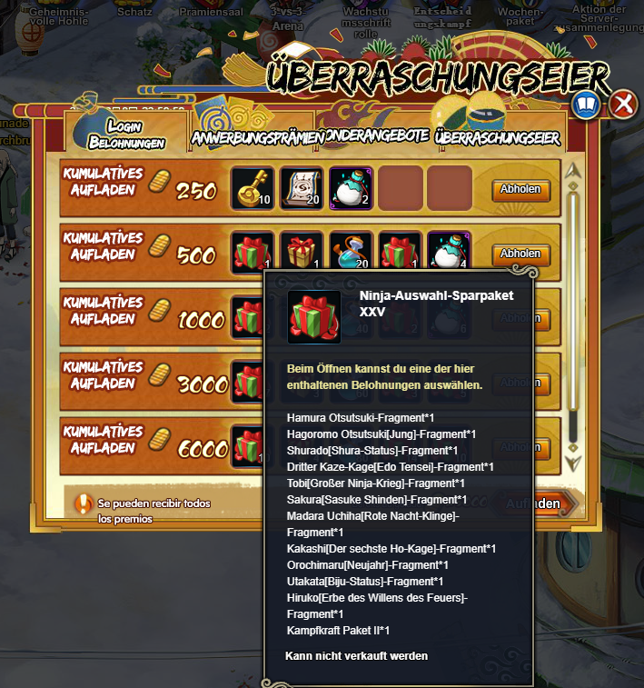 500Goldbarren: Ninja-Auswahl-Sparpaket XXV*1, Geheimrolle Unterstüzungspaket*1, Trainingstrank*20,2025 Neues Myoboku-Berg-Auswahlpaket (20)*1, Flasche der Wahrheit*4
