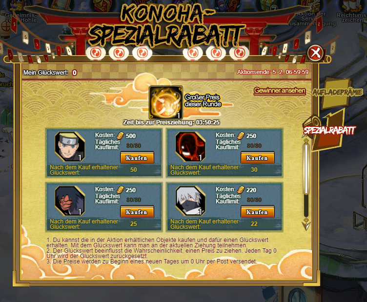 Beim Kauf von Gegenständen erhältst du Glückswert, mit dem du an der Preisziehung teilnehmen kannst, die täglich um 0 Uhr stattfindet. Nach jeder Ziehung wird der Glückswert zurückgesetzt und die Belohnung per Nachricht verschickt.