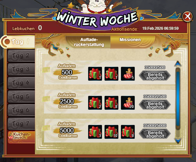 "Während des Aktionszeitraums kannst du jeden Tag Aufladerückerstattungen erhalten. Außerdem kannst du durch Abschließen der täglichen Aufträge unter Anderem Erinnerungsmünzen erhalten, die du gegen weitere wertvolle Gegenstände eintauschen kannst.