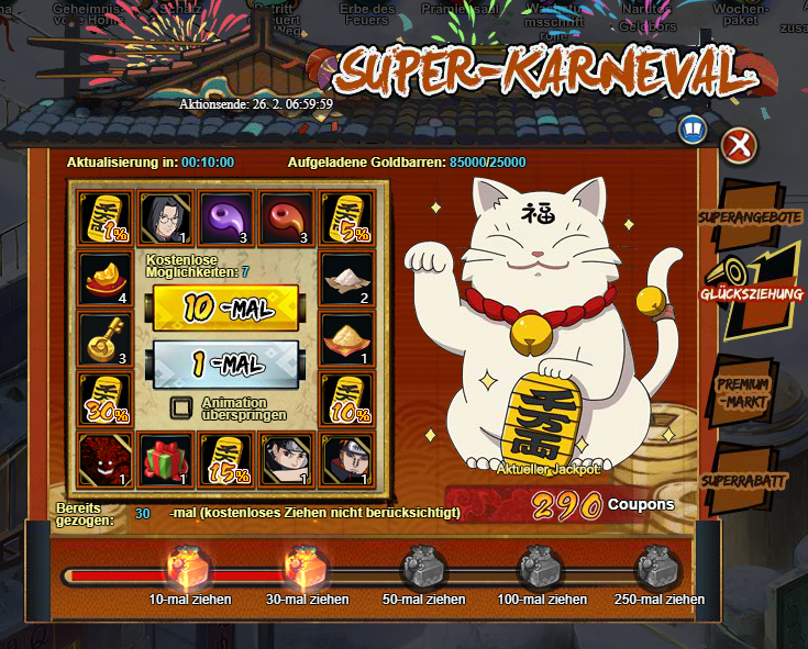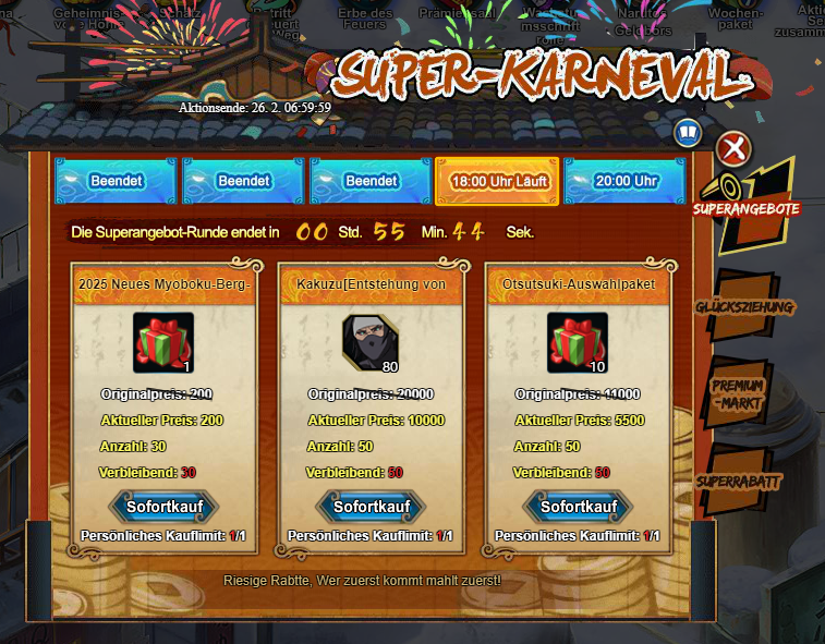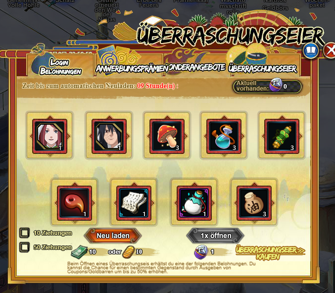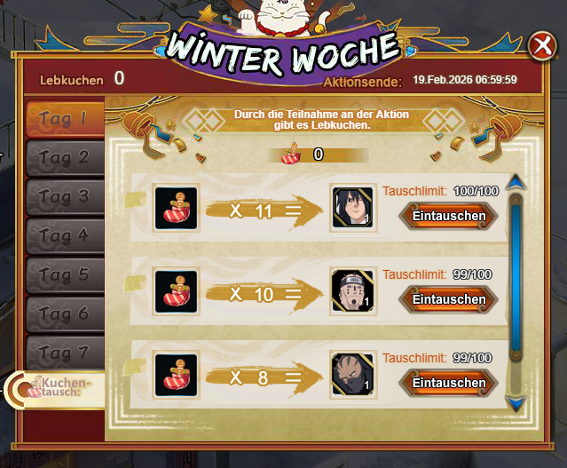 Zahle Goldbarren in Narutos Geldbörse ein, um sofort eine Rückerstattung in Form von Coupons zu erhalten und während 6 Tagen täglich eine Gegenstandsbelohnung abzuholen.
