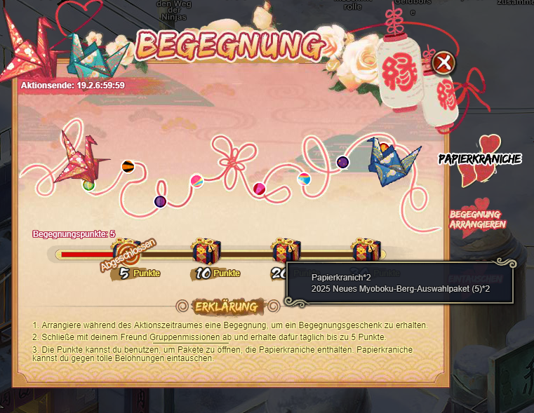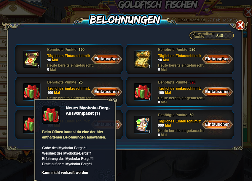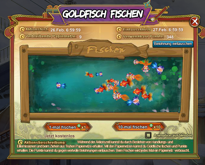 "Während der Aktionszeit kannst du beim Abschließen von Handlungsmissionen, Elitemissionen oder beim Ziehen aus Truhen Papiernetze erhalten. Damit kannst du Goldfische fischen und Punkte erhalten, die du gegen wertvolle Belohnungen eintauschen kannst.