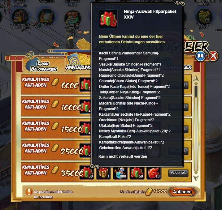 35000Goldbarren: Ninja-Auswahl-Sparpaket XXIV*30,Geheimrolle Unterstüzungspaket(Groß)*1,Trainingstrank*800,2025 Neues Myoboku-Berg-Auswahlpaket (20)*50,Superpsychisches Biest Durchbruchstein*10