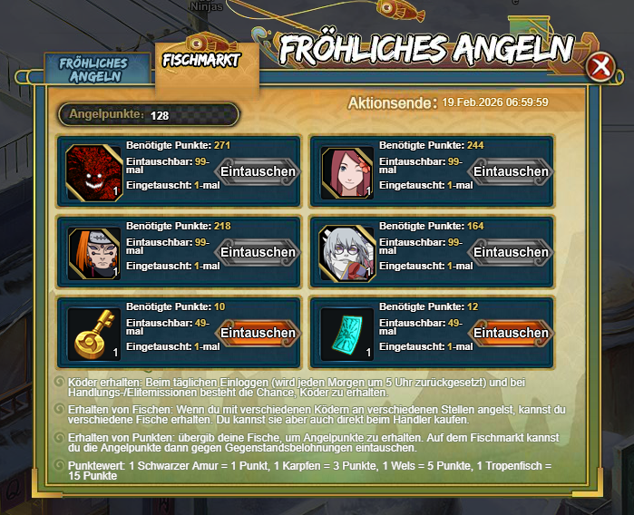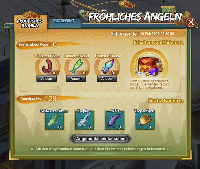 Beim Einloggen und durch Handlungs-/Elitemissionen kannst du täglich bis zu 20 Köder erhalten. Suche je nach Art des Köders den entsprechenden Angelpartner auf und angle verschiedene Fische. Diese kannst du sonst auch beim Händler kaufen. Anhand der Fischart und der Anzahl erhältst du Angelpunkte, die du auf dem Fischmarkt gegen Gegenstände eintauschen kannst.