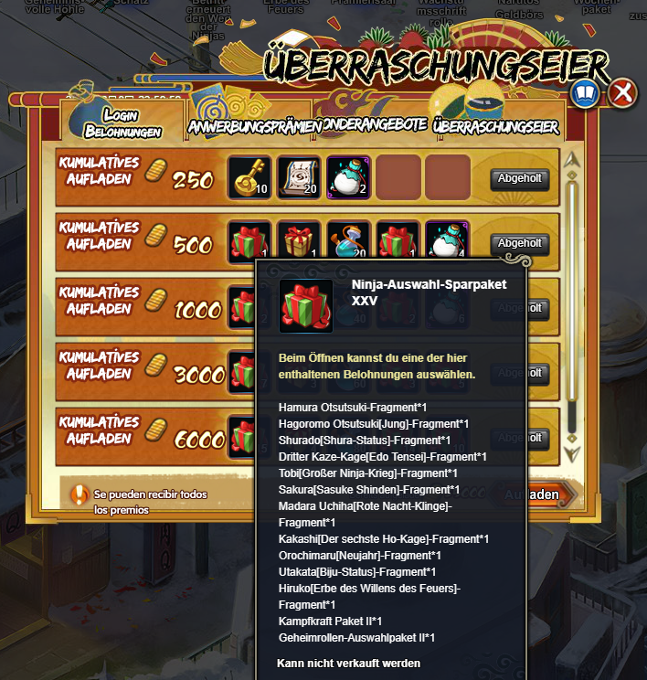 500Goldbarren: Ninja-Auswahl-Sparpaket XXV*1,Geheimrolle Unterstüzungspaket*1,Trainingstrank*20,2025 Neues Myoboku-Berg-Auswahlpaket (20)*1,Flasche der Wahrheit*2